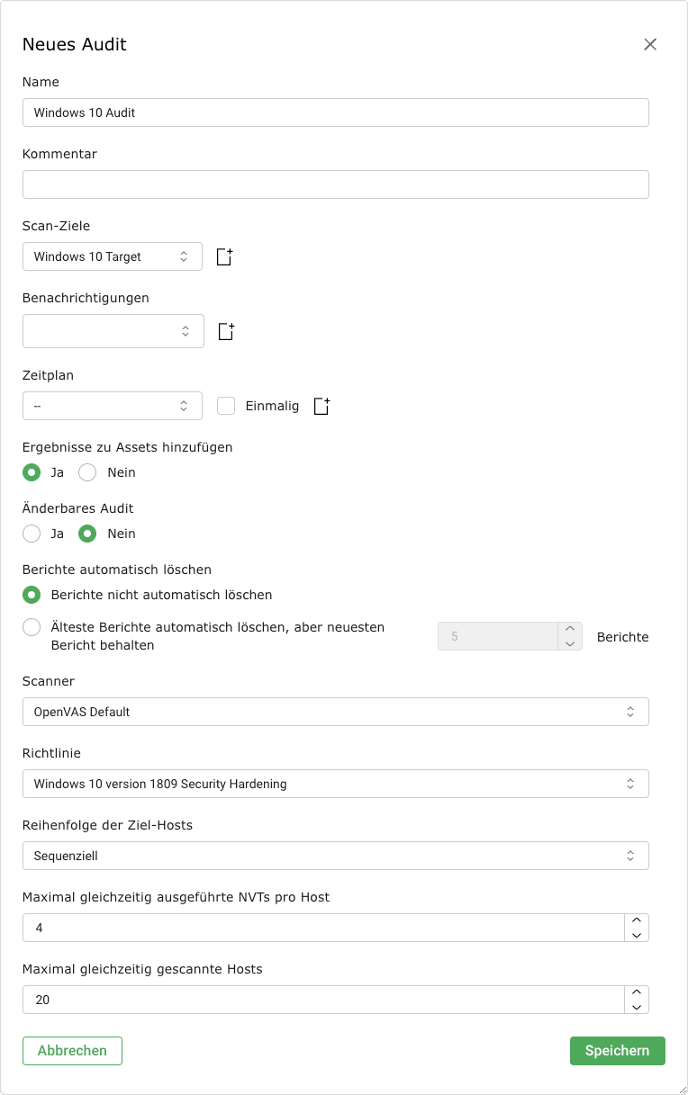 Da das Ziel der meisten Audits die Überprüfung lokaler Sicherheitskonfigurationen auf den Zielsystemen ist, ist es im Allgemeinen und im Zweifelsfall empfehlenswert, authentifizierte Audits durchzuführen (siehe Kapitel 9.4.2). Ausnahmen bestehen für Audits, die nur extern verfügbare Dienste überprüfen, z. B. SSL/TLS.