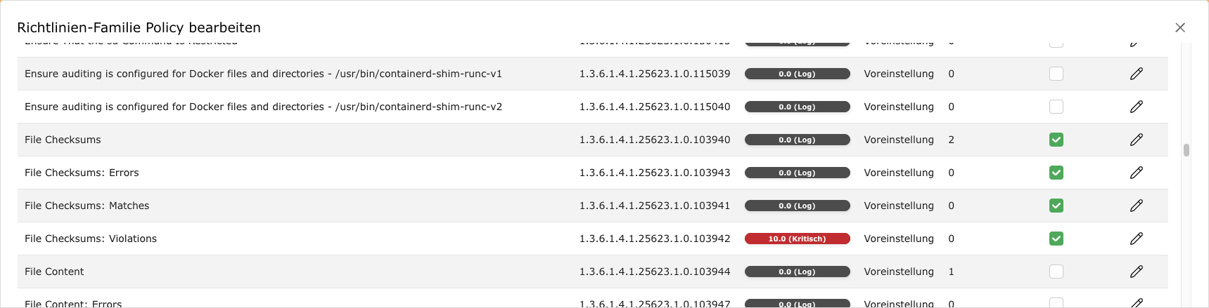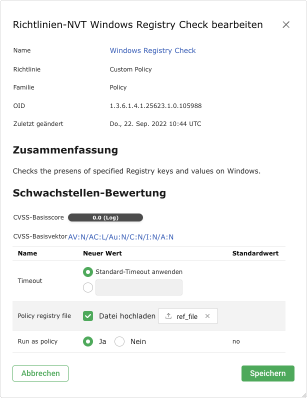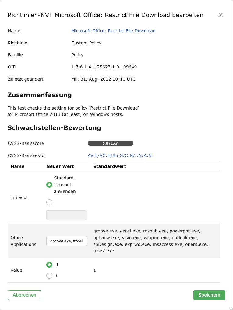 Falls systemspezifische VTs der VT-Familie Policy genutzt werden (z. B. beginnend mit „Linux“, „Microsoft Windows“, „Microsoft Office“), muss der Radiobutton Ja für Verbose Policy Controls im VT Compliance Tests (VT-Familie Compliance) gewählt werden.