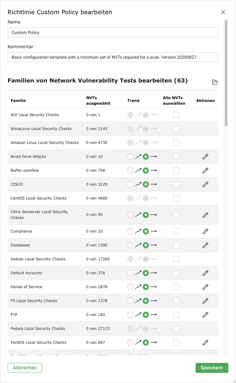 Im Abschnitt Familien von Network Vulnerability Tests bearbeiten die Checkboxen Alle NVTs auswählen aktivieren, falls alle VTs einer Familie aktiviert werden sollen.