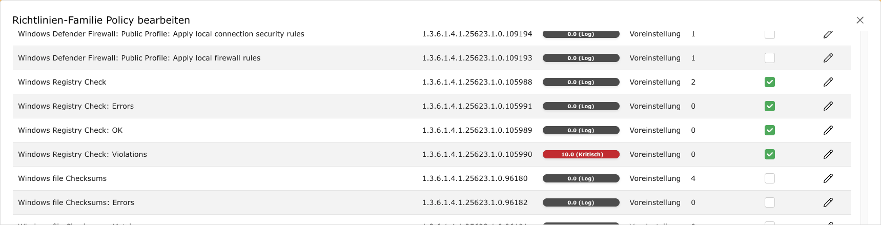 Alle Scanner-Vorgaben für die Richtlinie mit aktuellen und Standardwerten.