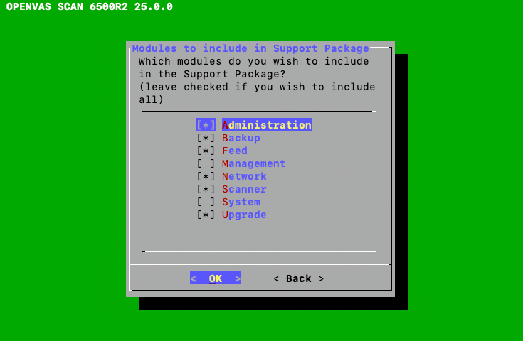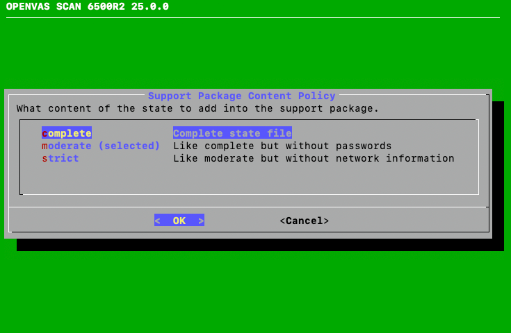 Manchmal benötigt das Greenbone Support Team zusätzliche Informationen, um Fehler zu beheben und die Kundschaft zu unterstützen. Die erforderlichen Daten werden als (verschlüsseltes) Supportpaket gesammelt, das Konfigurationsdaten der Appliance enthält.