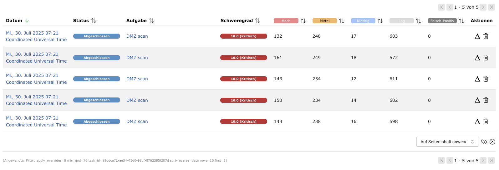 Nach dem Starten eines Scans kann der Bericht der bis dahin gefundenen Ergebnisse angesehen werden. Wenn der Scan abgeschlossen ist, ändert sich der Status zu Abgeschlossen und keine weiteren Ergebnisse werden hinzugefügt.