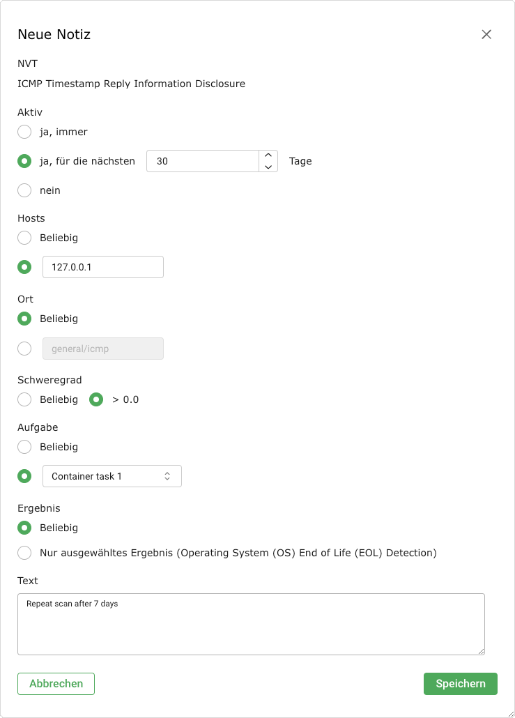 Notizen können durch Wählen des Radiobuttons Beliebig für Hosts, Orte, Schweregrade, Aufgaben oder Ergebnisse generalisiert werden.