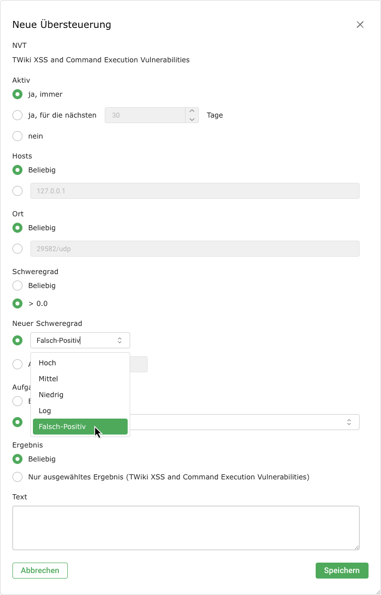 Übersteuerungen sind insbesondere nützlich, um Ergebnisse zu verwalten, die als falsch-positiv erkannt wurden oder denen ein kritischer Schweregrad zugeordnet wurde, wobei der Schweregrad zukünftig ein anderer sein soll.