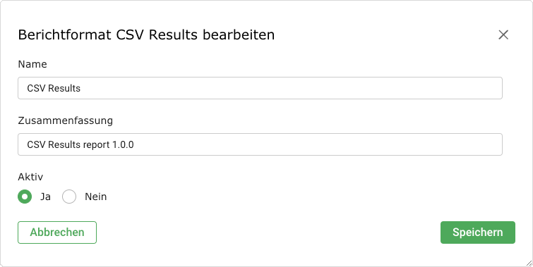 Die Berichtformate sind in den entsprechenden Auswahlmenüs nur verfügbar, wenn sie aktiviert wurden. Neu importierte Berichtformate sind am Anfang immer deaktiviert. Ein Berichtformat kann nur aktiviert werden, wenn ihm vertraut wird.
