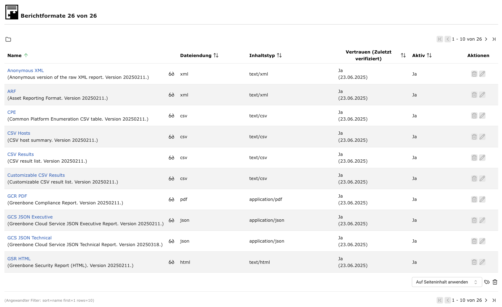 Alle Standardberichtformate von Greenbone sind Datenobjekte, die über den Feed verteilt werden. Sie werden mit jedem Feed-Update heruntergeladen und aktualisiert.