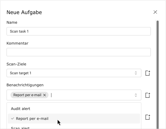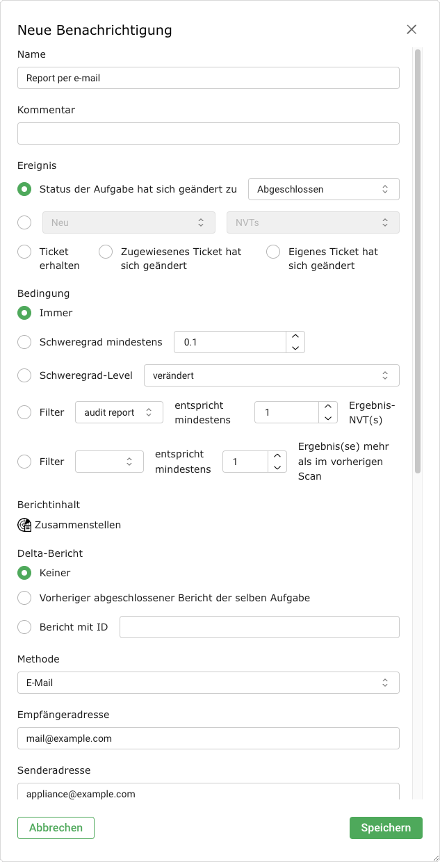 Falls eine E-Mail-Adresse in das Eingabefeld E-Mail-Bericht an eingegeben wird, wird eine Benachrichtigung erstellt, die eine E-Mail versendet, sobald die Aufgabe abgeschlossen ist (siehe Kapitel 9.14).