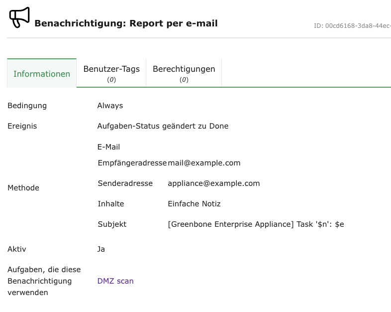 Gewählte Benachrichtigungsmethode mit zusätzlichen Informationen, z. B. an welche IP- oder E-Mail-Adresse die Benachrichtigung gesendet wird.