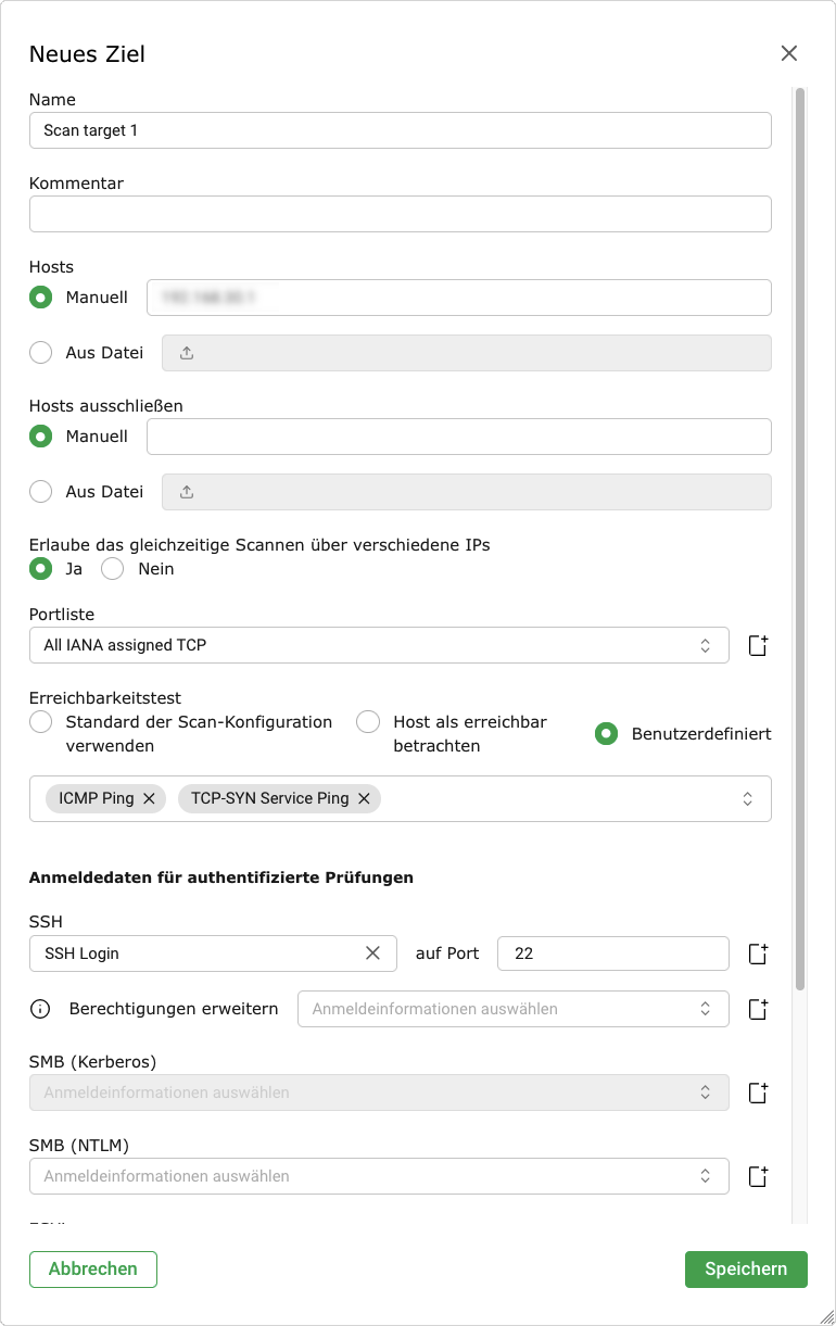 Um dieses Problem zu beseitigen, müssen sowohl die Konfiguration des Ziels als auch die Scan-Konfiguration die Einstellung des Erreichbarkeitstest unterstützen (siehe Alive Test).