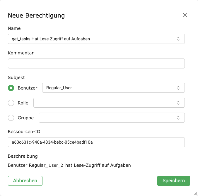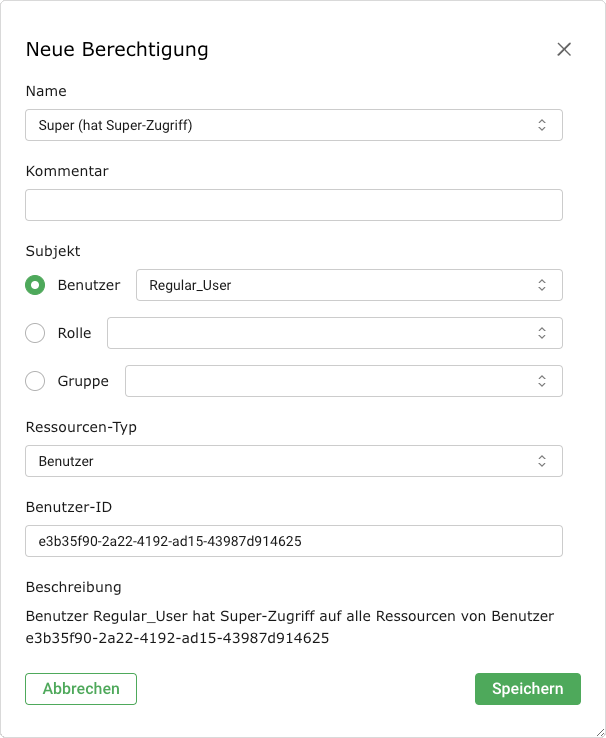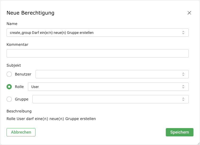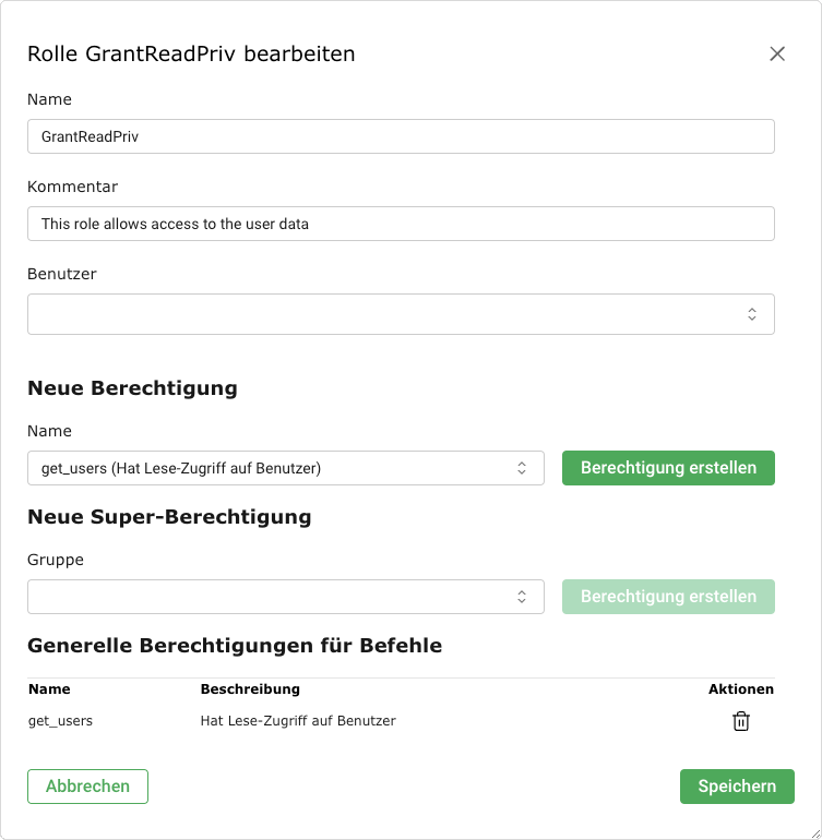 Die Rolle definiert die Berechtigungen eines Benutzers. Jeder Benutzer kann mehrere Rollen haben.