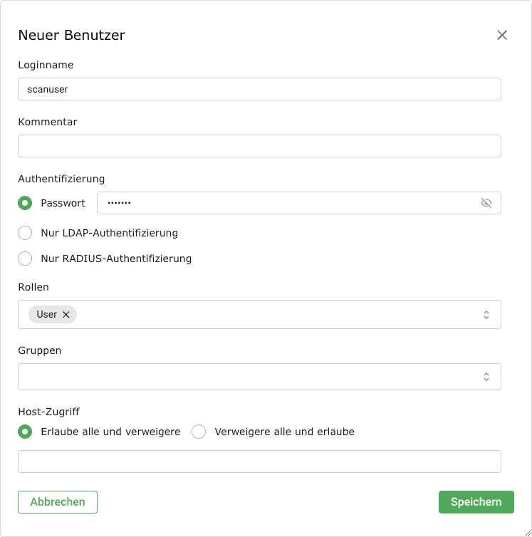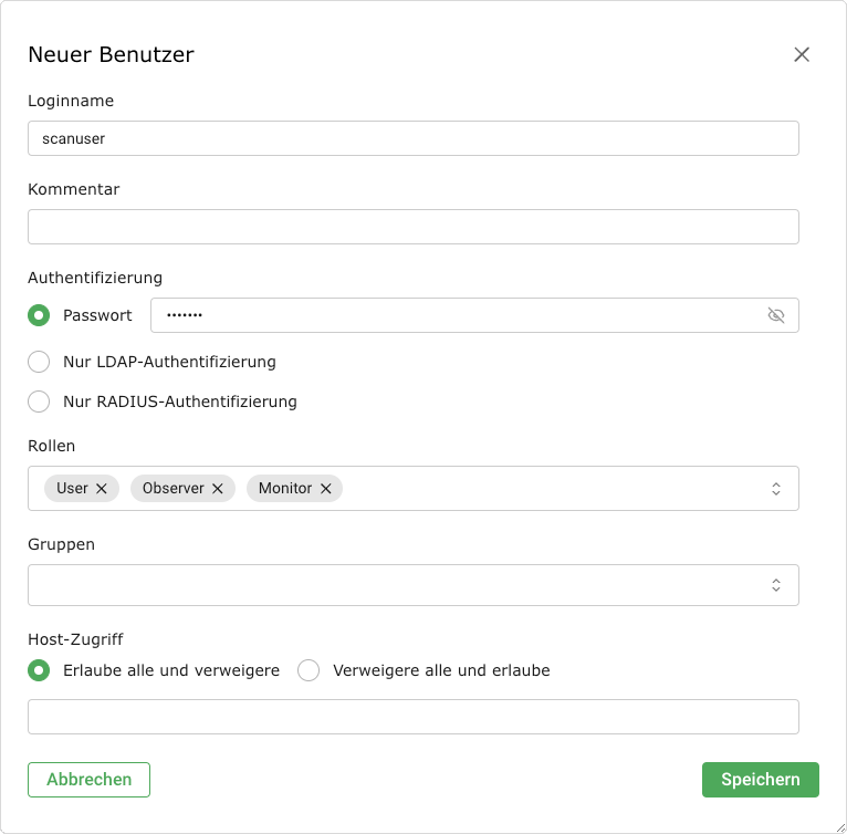 Hosts, auf denen der Benutzer Scans ausführen darf. Die Einschränkungen gelten auch für Administratoren, aber diese können sie selbst aufheben. Benutzer mit der Rolle User oder einer Rolle ohne Zugriff auf die Benutzerverwaltung können die Einschränkungen nicht umgehen. Grundsätzlich ist entweder eine Denylist (alle erlauben und einige verbieten) oder eine Allowlist (alle verbieten und einige erlauben) möglich.