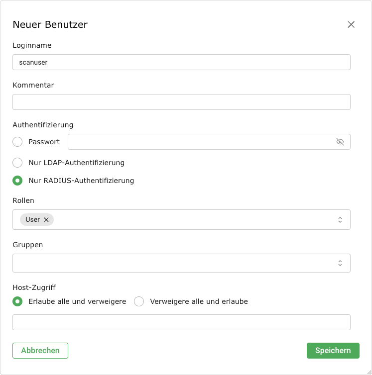 Bei Verwendung einer zentralen Benutzerverwaltung (siehe Kapitel 8.5) können je nach LDAP- oder RADIUS-Server Einschränkungen hinsichtlich der Länge und der Zeichentypen gelten. Außerdem muss der Benutzer mit genau demselben Namen (rDN) erstellt werden, den der Server verwendet.
