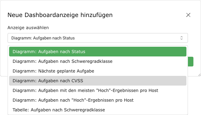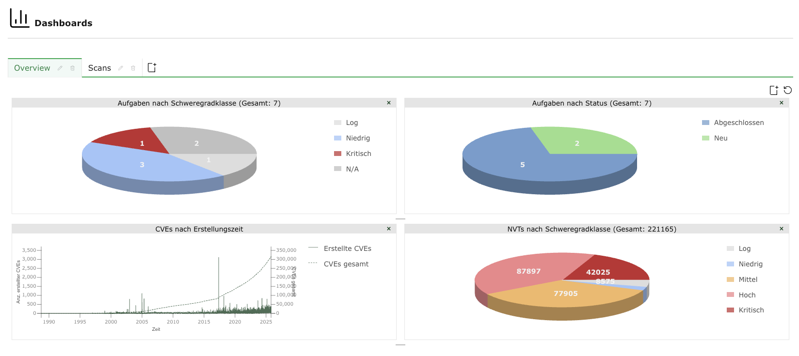 Es können bis zu 10 Dashboards vorhanden sein. Standardmäßig gibt es nur das Dashboard Übersicht, welches einen kurzen Überblick über Aufgaben, CVEs und VTs gibt (siehe Abb. 7.4).