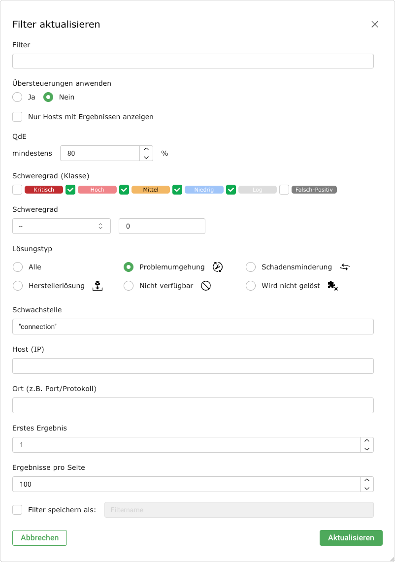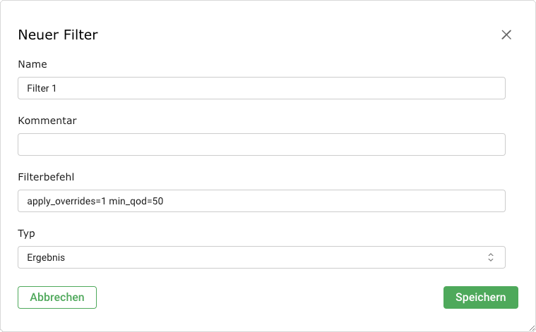 Wenn der Filter für eine spätere Verwendung gespeichert werden soll, Checkbox Filter speichern als aktivieren und einen Namen für den Filter in das Eingabefeld eingeben.