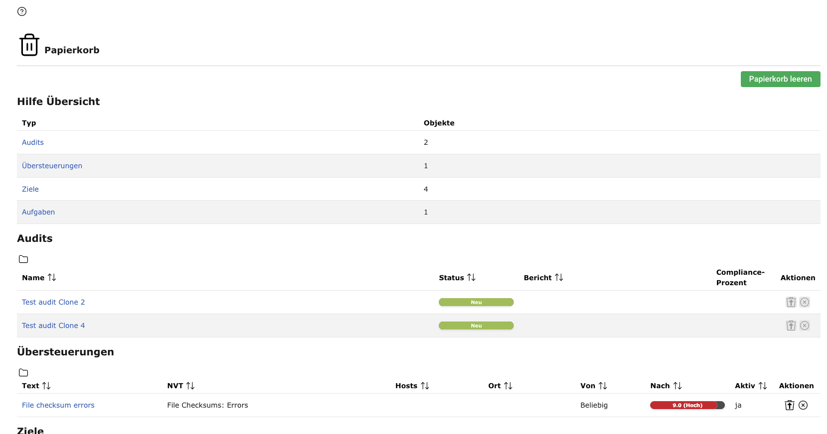 Die Seite Papierkorb kann durch Wählen von Administration > Papierkorb im Menü geöffnet werden. Die Seite listet alle Ressourcen, die sich momentan im Papierkorb befinden, gruppiert nach Ressourcentyp auf.