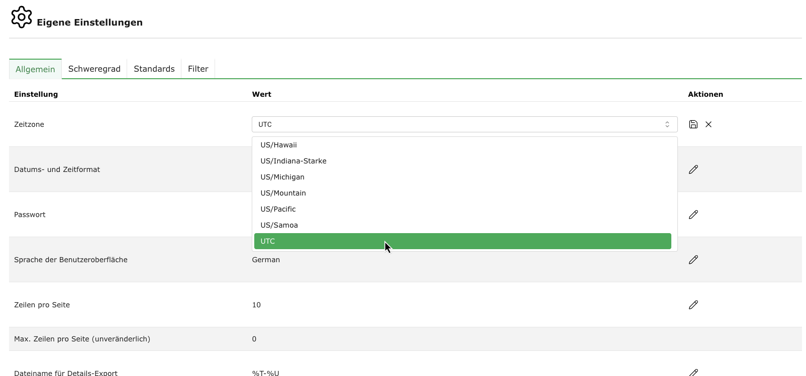 Auswahl der Zeitzone, die zur Anzeige von Informationen verwendet wird. Die Appliance speichert intern alle Informationen in der Zeitzone UTC±00:00. Um die Daten in der Zeitzone des Benutzers anzuzeigen, muss die entsprechende Auswahl getroffen werden.
