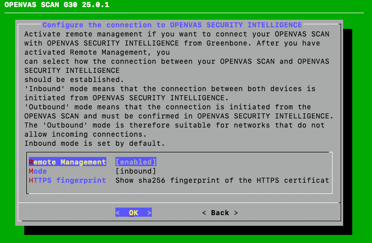 Shell access is not required for any administrative work but can be requested by the Greenbone Support Team for diagnostics and support.