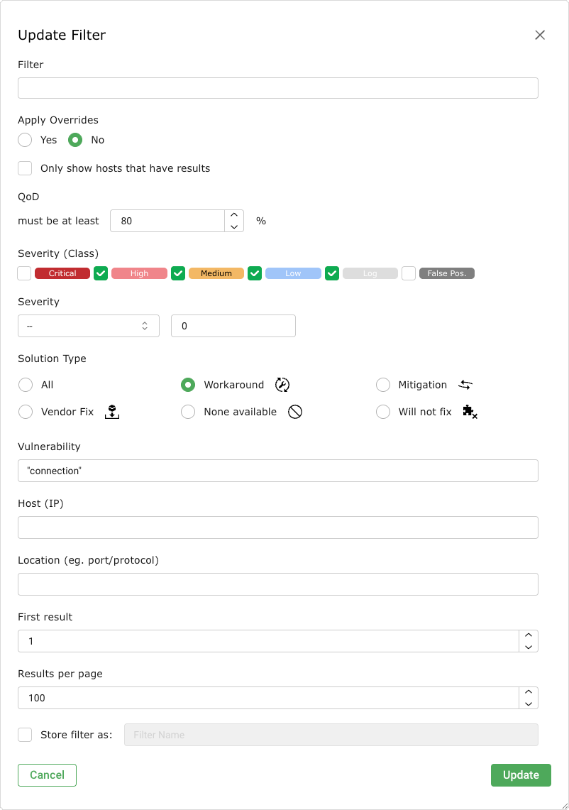 If multiple overrides match a result, for example one override for a host range and another for a host within this range, the more specific override (going by result, task, port and severity) is applied. If multiple, equally specific overrides match a result, the most recently created override is applied.