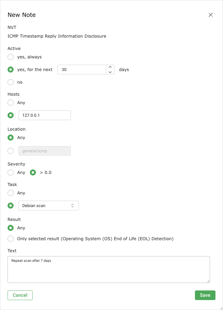 Notes can be generalized by selecting the radio button Any for hosts, locations, severities, tasks or results.