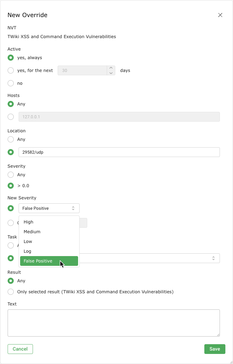 Define the override. Select the new severity in the drop-down list New Severity (see Fig. 10.25).