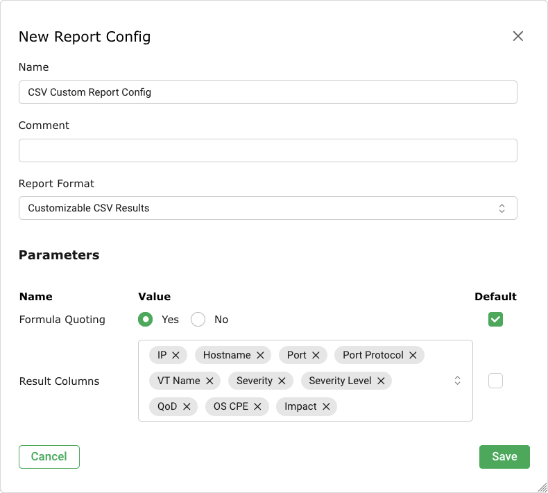 Default report formats cannot be edited. Furthermore, they can only be deleted temporarily by the Feed Import Owner or by a super administrator. During the next feed update, they will be downloaded again.