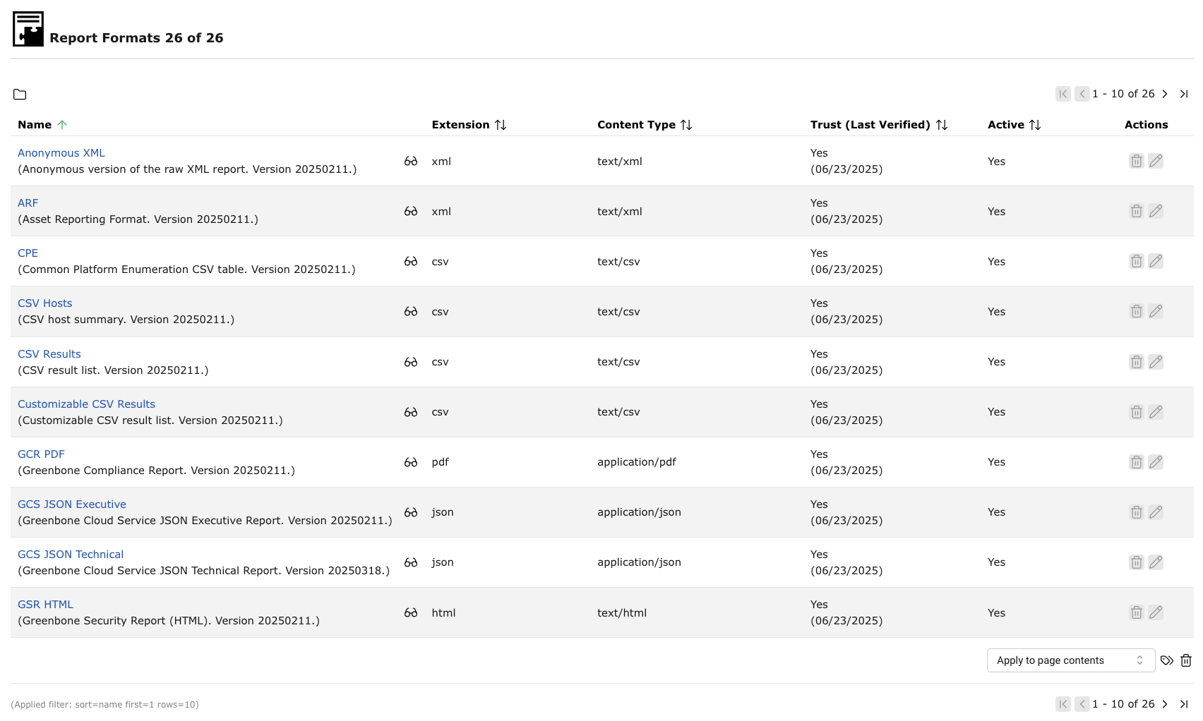 Some report formats only convert data, while others perform more complex operations and also execute programs. To prevent abuse, each report format plug-in has to be digitally signed by Greenbone. The digital signatures are distributed via the OPENVAS ENTERPRISE FEED. If a signature is authentic and the publisher is trusted, it is ensured that the report format exists in the exact format as certified by the publisher. The trust check is automatic and the result can be seen in the column Trust (Last Verified).