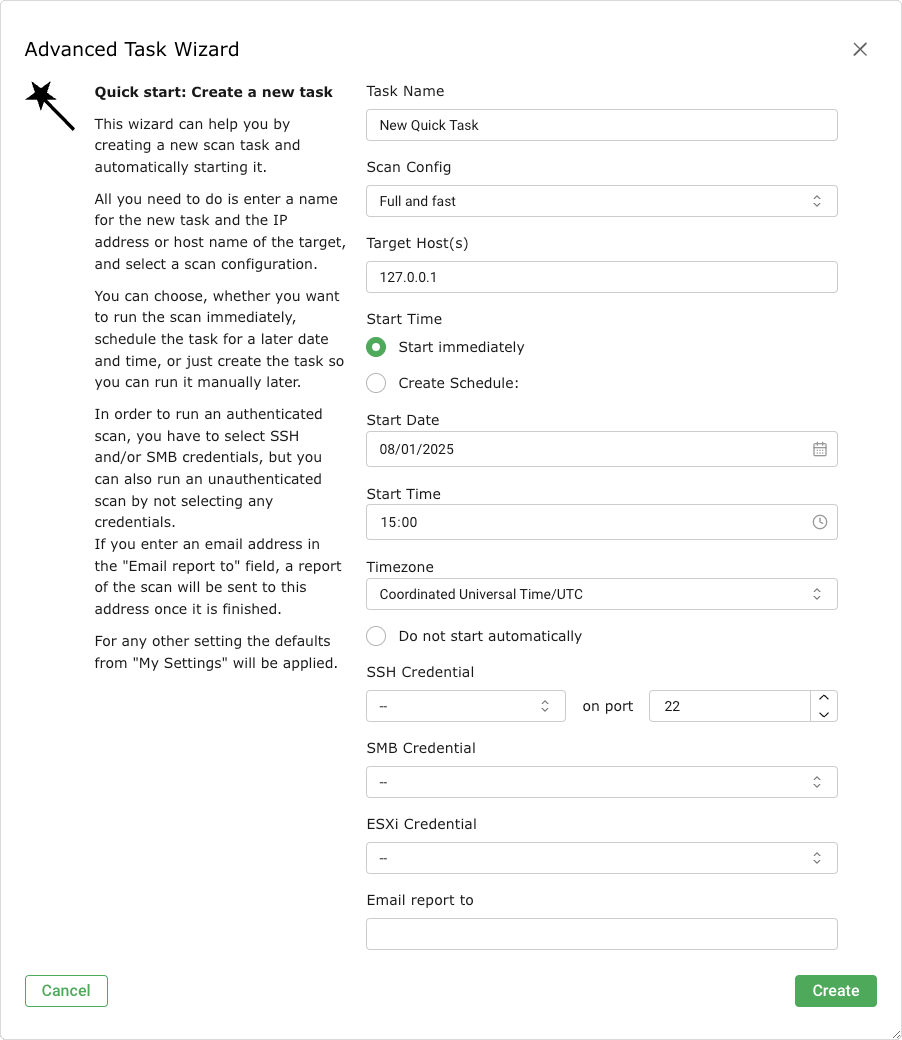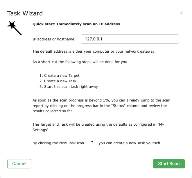 The task wizard can configure and start a basic scan with minimal user input.