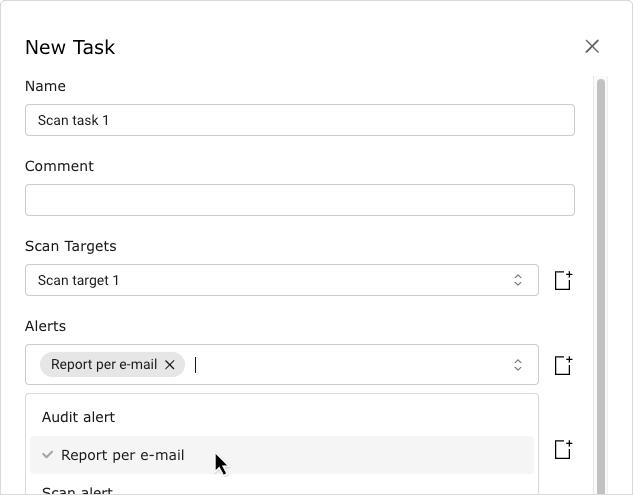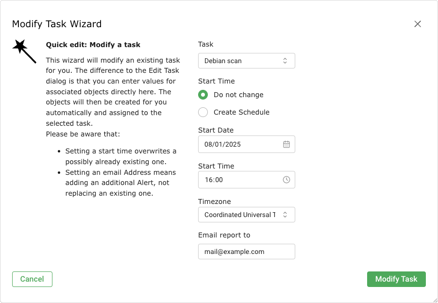If an e-mail address is entered in the input box Email report to an alert is created sending an e-mail as soon as the task is completed (see Chapter 9.13).