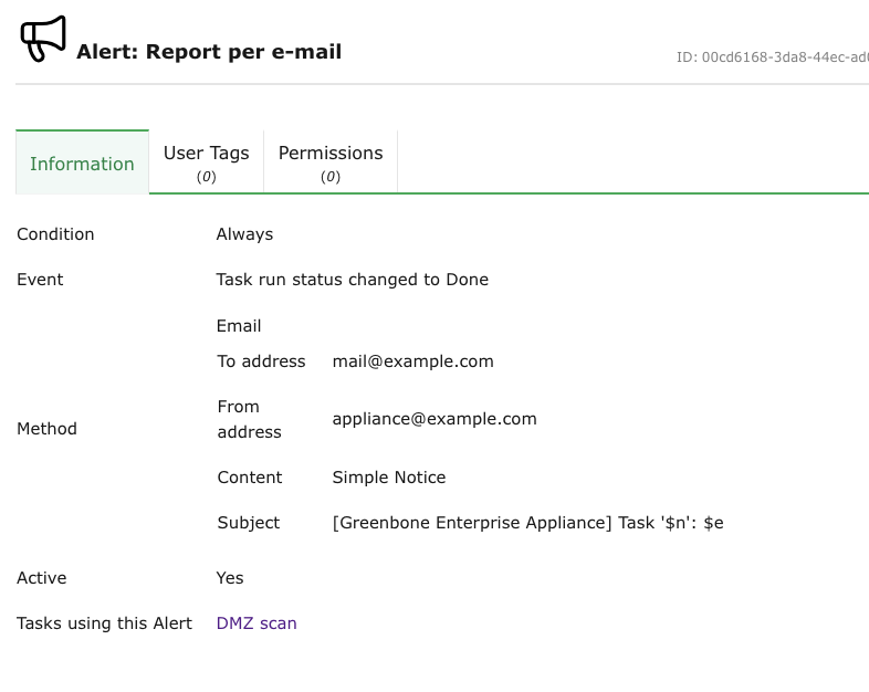 Chosen alert method with additional information, for example to which IP address or e-mail address the alert message is sent.