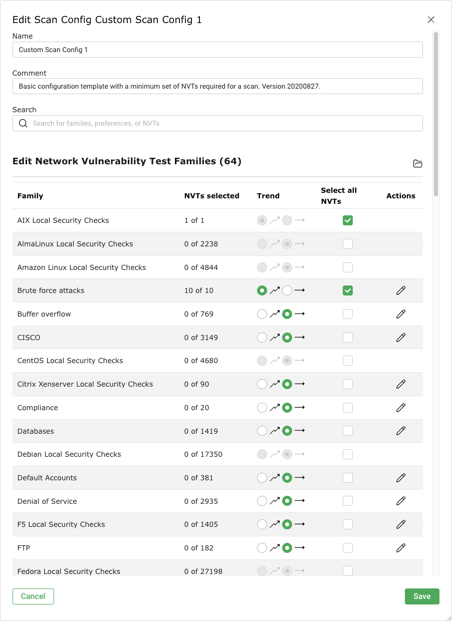 This happens especially very often if UDP based VTs like VTs using the SNMP protocol are used. If the default configuration Full and fast is used, the SNMP VTs are included. But if the target is configured using the default port list, the VTs are not executed. This happens because the default port list does not include any UDP ports. Therefore, the port 161/UDP (SNMP) is not discovered and excluded from further scans. Both the discovery scans and the recommended scan configuration Full and fast optimize the scan based on the discovered services. If the UDP port is not discovered, no SNMP VTs are executed.
