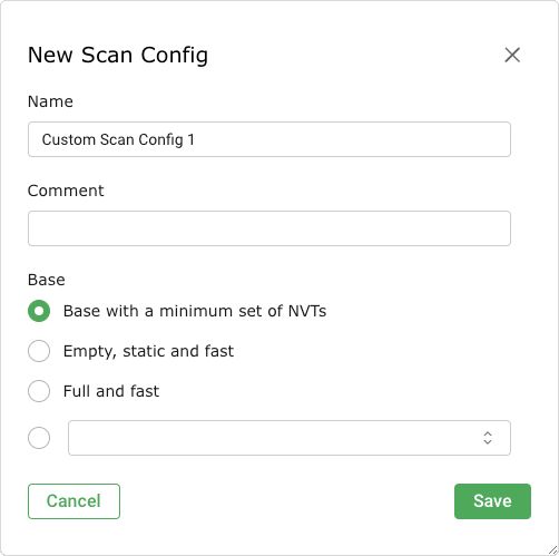 The format of the report can be chosen from the installed report formats. If a customizable report format is selected (Customizable CSV Results, Topology SVG, Verinice ISM or Verinice ISM all results), a report configuration can be chosen as well.