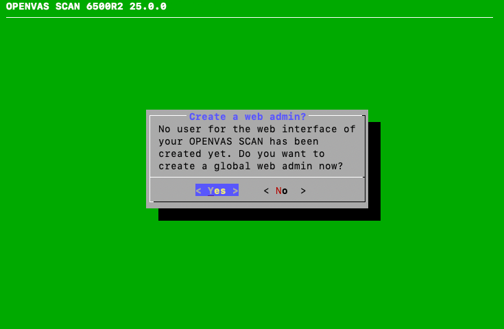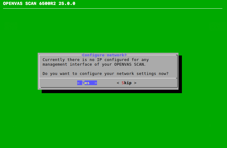 When the appliance is delivered by Greenbone or after a factory reset, the GOS administration menu shows the first setup wizard after logging in to assist with the basic GOS configuration (see Fig. 4.8).