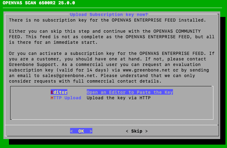 4.4.4 Entering or Uploading an OPENVAS ENTERPRISE FEED Subscription Key¶