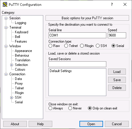 In Microsoft Windows, PuTTY can be used. After starting it, the options as shown in Fig. 4.1 and the appropriate serial port must be selected.