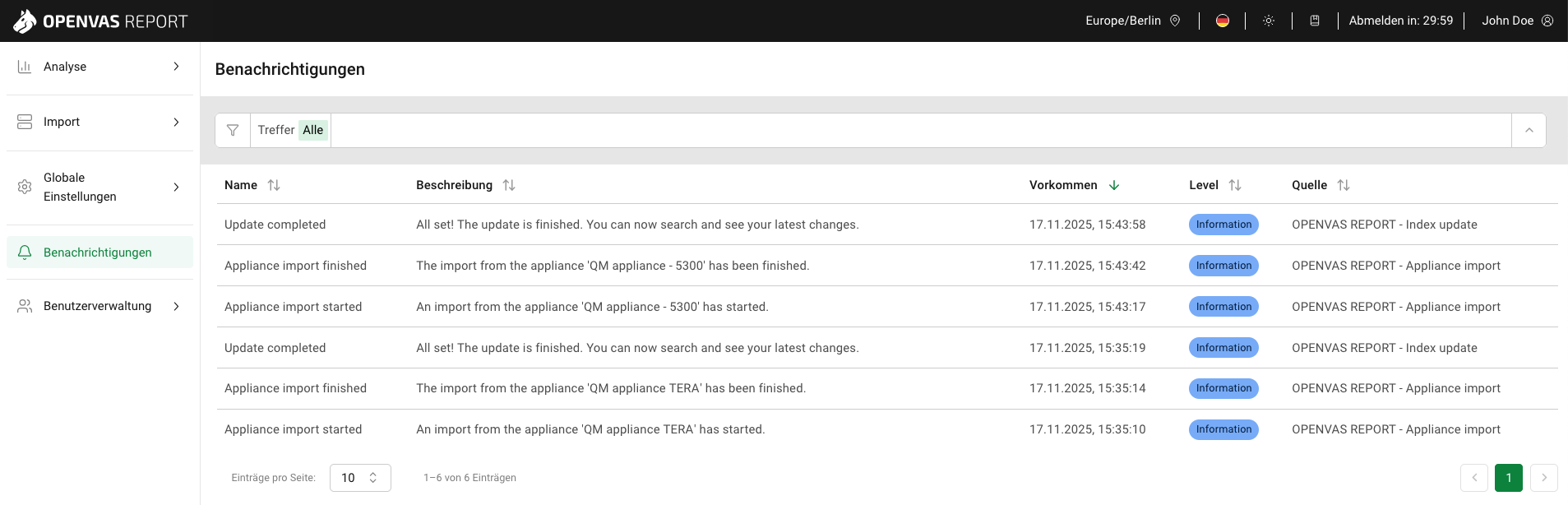 Die Seite Benachrichtigungen bietet einen Überblick über Systemmeldungen zu wichtigen Ereignissen in OPENVAS REPORT. Dies können sowohl Erfolgsmeldungen als auch Warnungen oder Fehlermeldungen sein.
